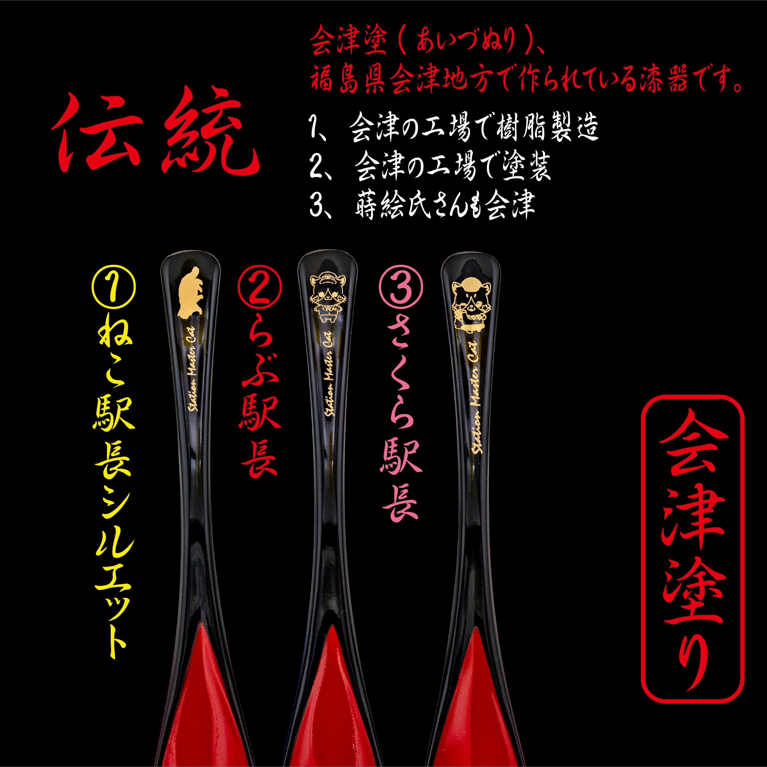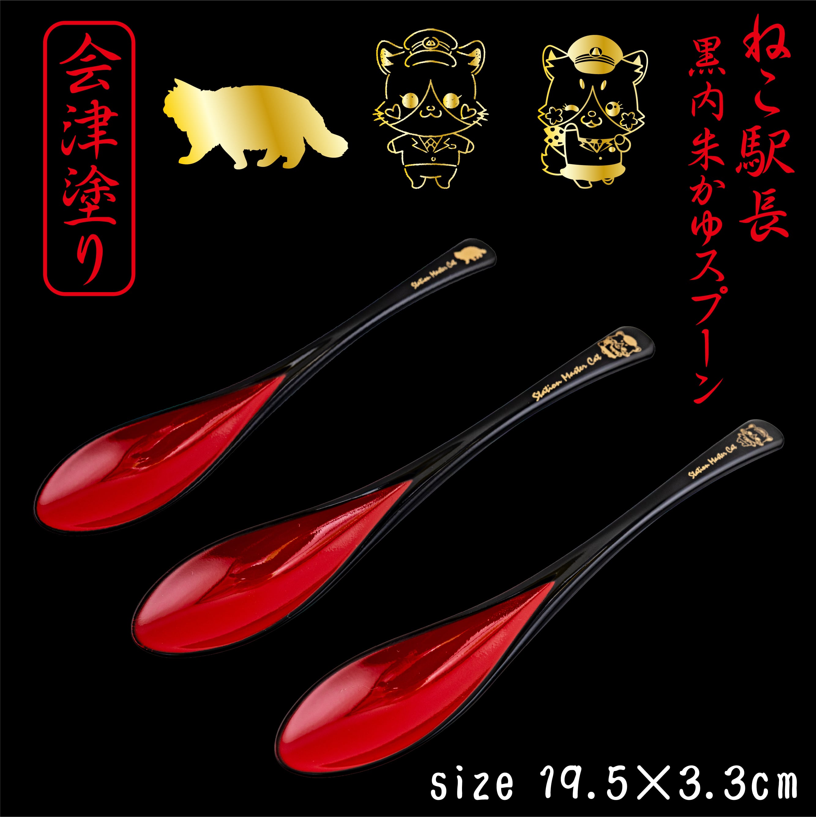 ・会津塗の伝統技術を駆使した、かわいらしいねこ駅員のスプーンです。食卓に華やかさを添えながら、お食事のひとときを楽しく演出します♪